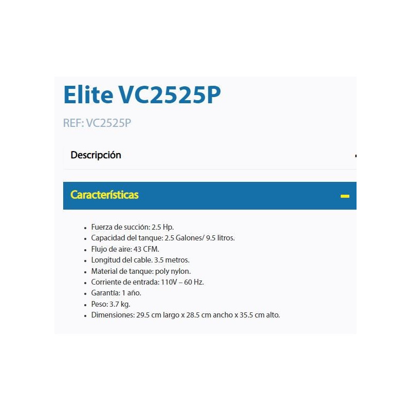 La aspiradora y sopladora Elite para uso profesional, con fuerza de succión de 2.5 Hp y capacidad de tanque de 9.5 litros o 2.5 galones, es ideal para húmedo y seco. Perfecta para limpieza de interior de vehículos, limpieza de sofás, cortinas, alfombras y pisos en el hogar.